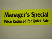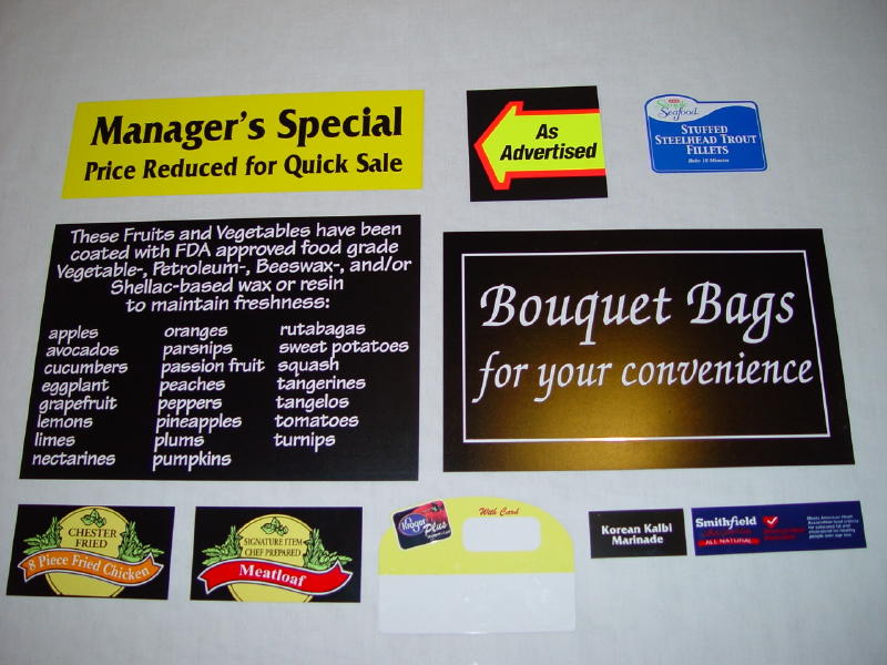 Signs are printed on a varity of 15mil to 1/4in. vinyl or polystryene. Custom artwork, shapes, sizes and quanities are not a problem. All costs quoted on a per job basis.